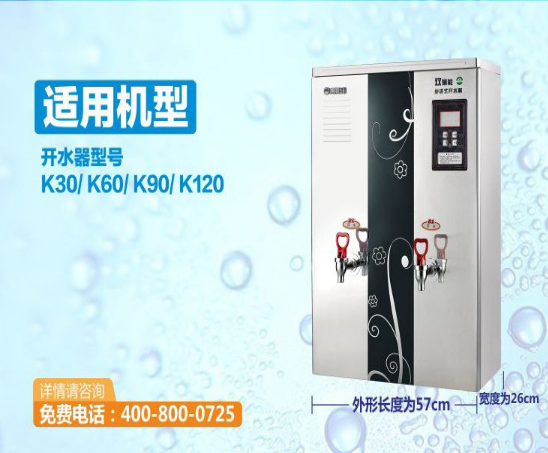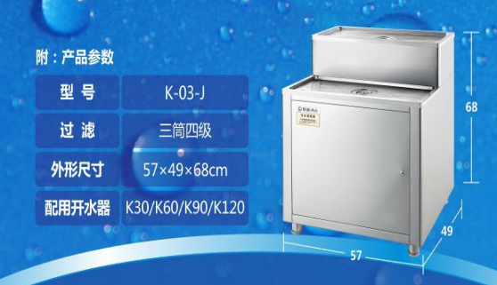 货号:K-03-J 过滤:3筒4级 配用开水器:前开门 JO-K30、K90、K60、K120 外形尺寸:57*49*68cm
